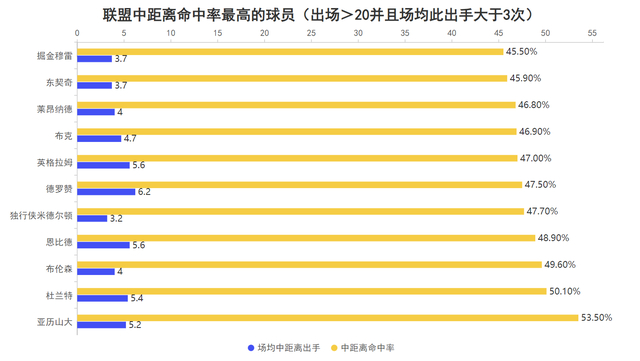在联盟场均非篮下三秒区出手3次以上的球员里,莱昂纳德53.6%的非篮下三秒区命中率位于联盟第十高,他在这个区域的终结表现虽然达不到最为顶尖的层次但也是联盟的最高档次;