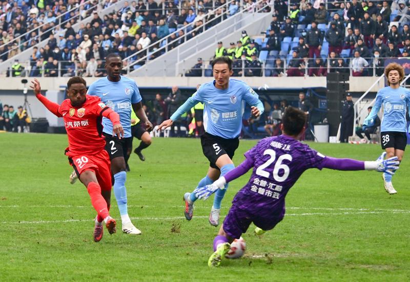 2025年11月22日,上海海港队球员加布里埃尔(左一)在比赛中射门得分。 当日,在辽宁大连举行的2025赛季中国足球协会超级联赛第30轮比赛中,上海海港队客场1比0战胜大连英博海发队,获得本赛季中超联赛冠军。 新华社发