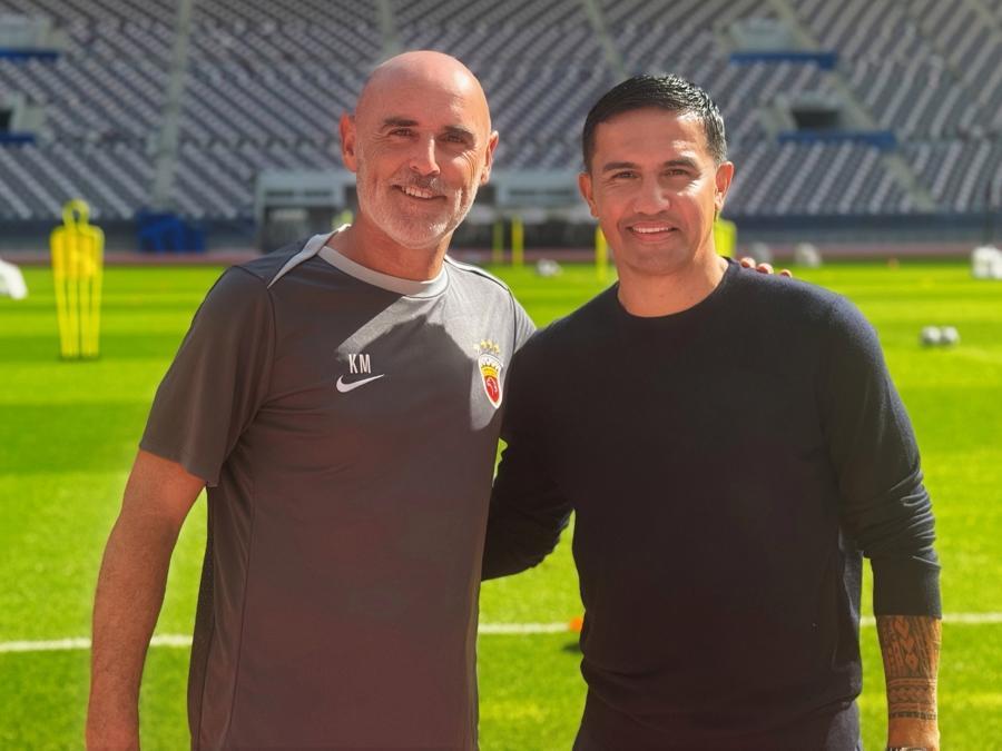 穆斯卡特率海港队在多哈展开集训,同为澳大利亚前国脚的卡希尔前去探班。