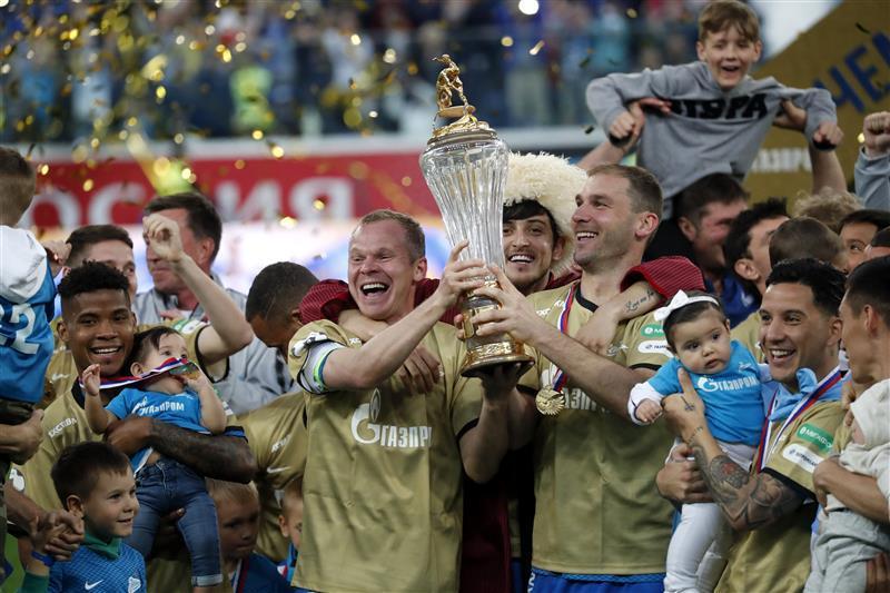 2019年5月5月12日,圣彼得堡泽尼特队球员庆祝夺冠。 当日,在2018-2019赛季俄罗斯足球超级联赛第28轮的比赛中,圣彼得堡泽尼特队主场以3比1战胜莫斯科中央陆军队,随后举行仪式庆祝提前夺得本赛季俄超联赛冠军。 新华社/欧新