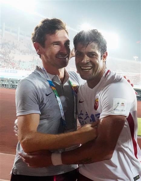 2017年9月30日,上海上港队球员胡尔克(右)与主教练博阿斯拥抱庆祝。 当日,在2017年足协杯半决赛第二回合比赛中,上海上港队客场以4比1战胜广州恒大队,最终上海上港队以6比2的总比分晋级决赛。 新华社记者刘大伟摄