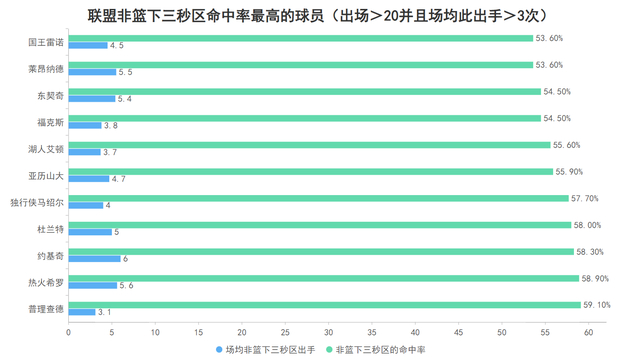 在篮下、非篮下三秒区与中距离莱昂纳德分别有着76.6%、53.6%与46.8%的命中率,三分线外虽然不算顶级但37.9%的命中率也接近40%的优秀水准,而他三分线内的命中率更是联盟至少出场20次球员中的顶级水准: